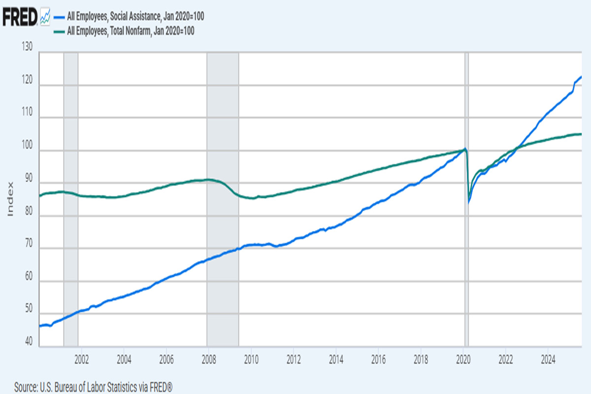 employment in social services (blue line below)