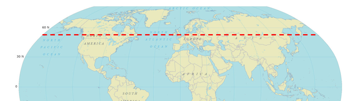 Agricultureal production drops sharply north fo 50 deg N latitude