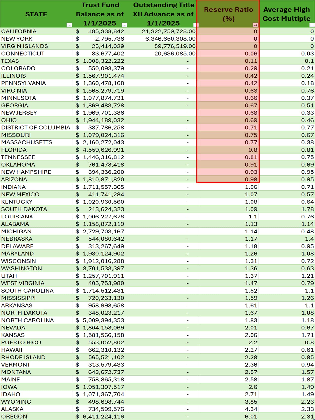 The red area is an area representing states remarked to the Biden DOL as have insufficient funds to cover a prolonged 1-year period of high unemployment.