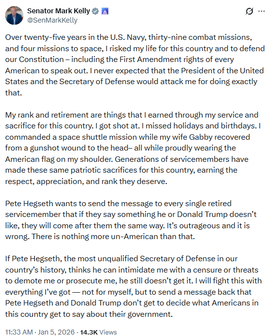 Hegseth also issued a formal letter of censure against Kelly, which the Defense secretary said details “reckless misconduct” by the retired Navy captain and astronaut.