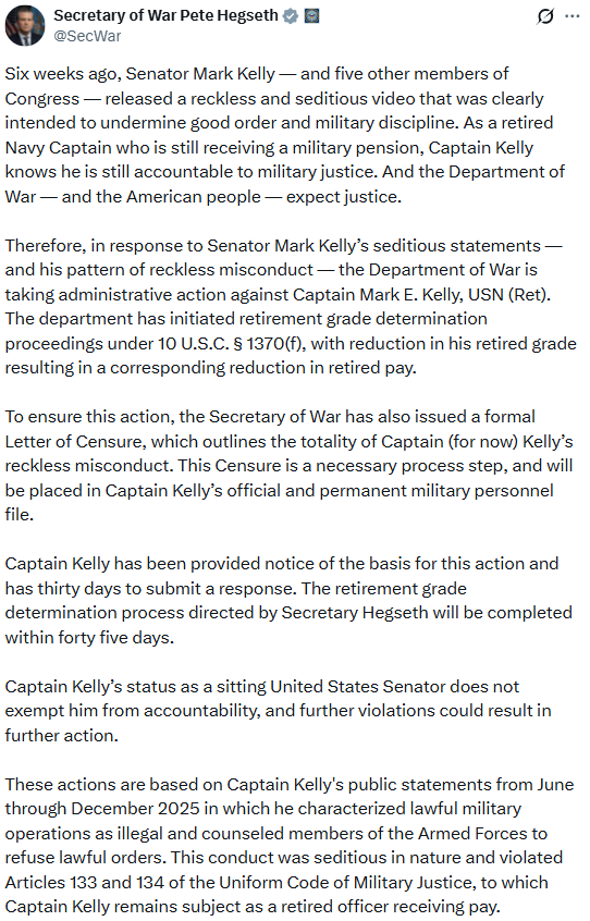 Hegesth said that the Defense Department has began a proceeding aimed at reducing Kelly’s rank in retirement, which would in turn lead to a decrease in retirement pay.