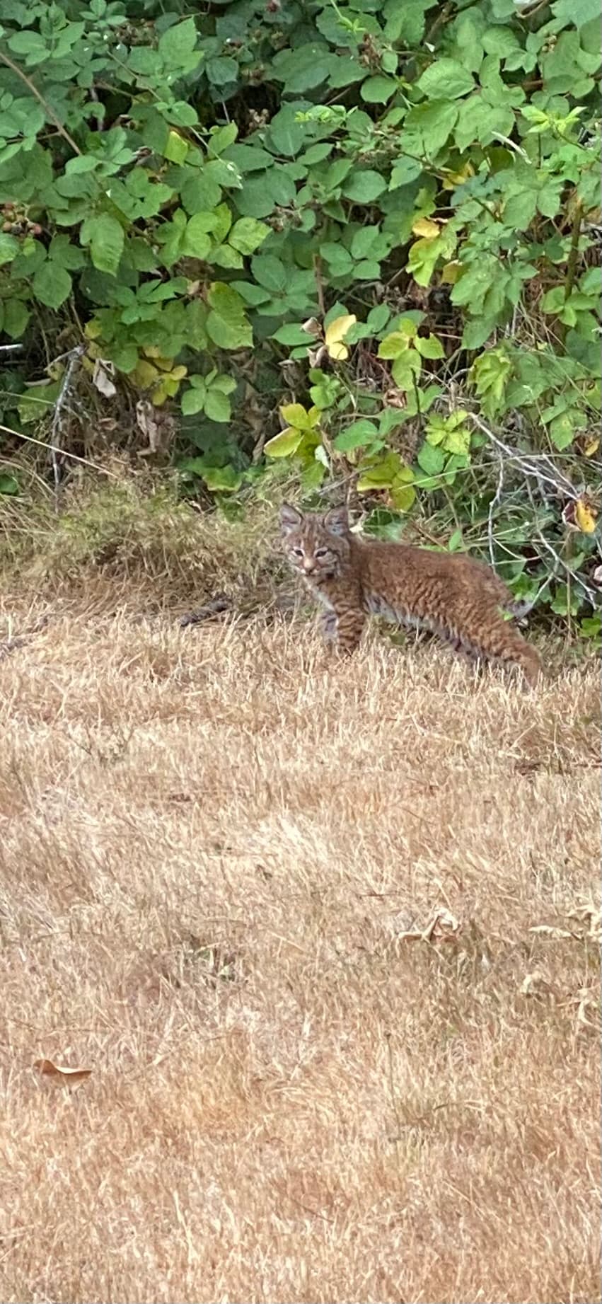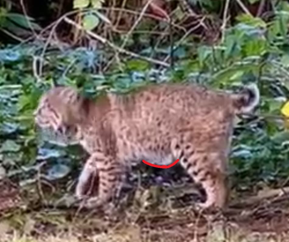 May have major problem here…a mother and her two cubs just passed by the post. She even sprayed it. Notice the height of cat and post. Her biggest cub I’m guessing is a male and little one is female. She’s about the size of Gimp and Clumsy.