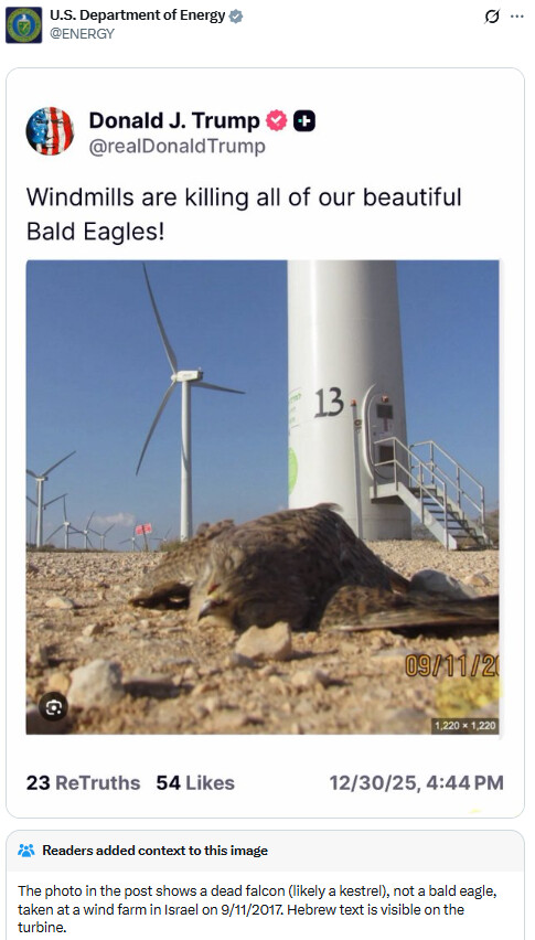 The official X account of the Department of Energy posts an image of a Trump post that features a picture of a windmill and a dead bird, with the caption, “Windmills are killing all of our beautiful Bald Eagles!”