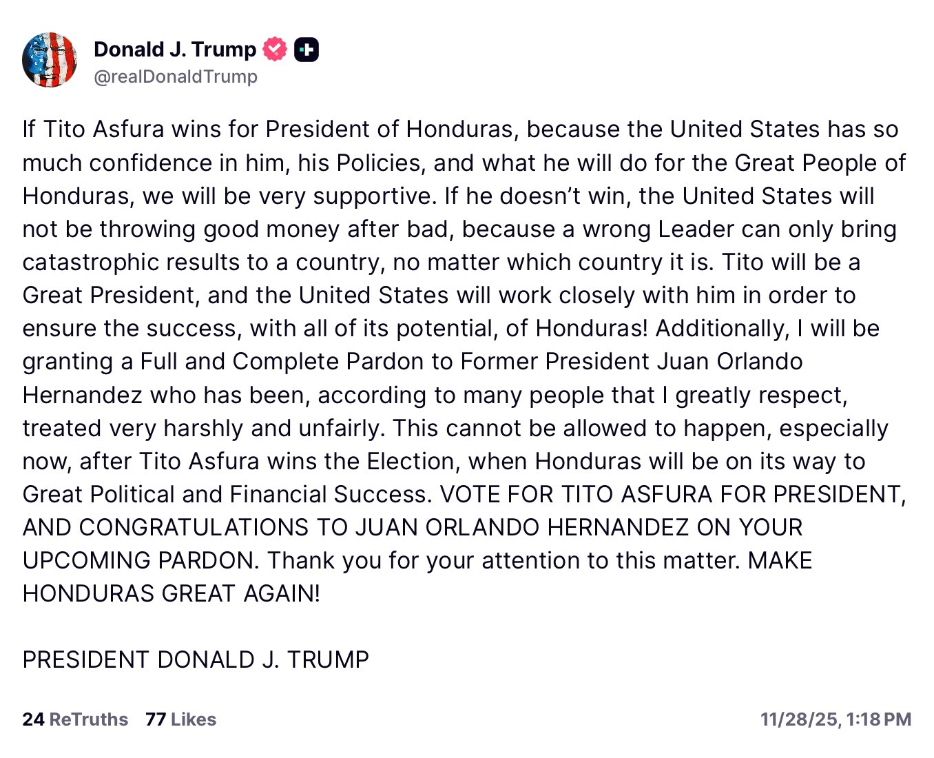 Donald does not care about you, about the drug cartels, the drugs that are killing Americans, he does not care that this man was found guilty in one of our courtrooms, of building an empire running loads of cocaine into America. What the ■■■■ is wrong with him. This cartel drug runner, treated so “unfairly” what the ■■■■ does that even mean?